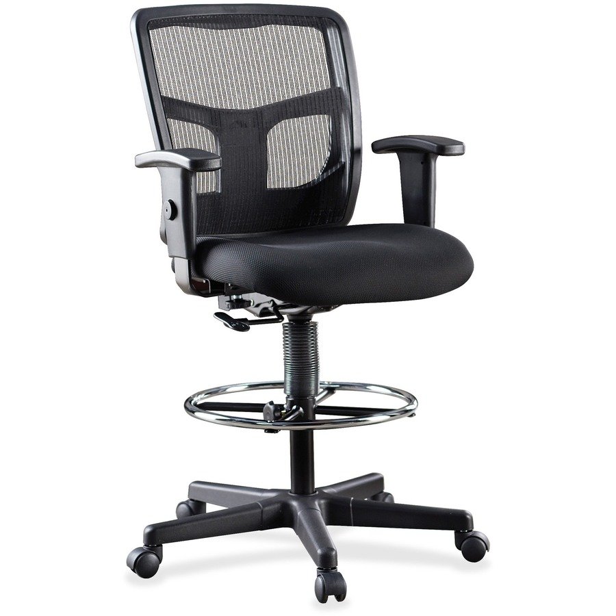 Mid-back stool offers ratchet back and a comfortable, breathable mesh back. Mesh is made of high-strength elastic nylon. Ergonomically designed mid-back is perfect for the natural curvature of a person’s back. Design also features a cushioned fabric seat and chrome footring to heighten your comfort. Included arms adjust in height (32″ x 42-1/2″) and in width (24″ to 26″) to suit your needs. Other functions include pneumatic seat-height adjustment from 25″ to 35-2/5″ , 360-degree swivel and back-height adjustment. 25-1/2″ diameter, five-star steel base has a polypropylene cap and casters for easy mobility. Seat size is 20″ wide x 18-7/10″ deep. Back measures 20″ wide (at the widest portion) x 19-7/10″ high. Weight capacity is 250 lb.